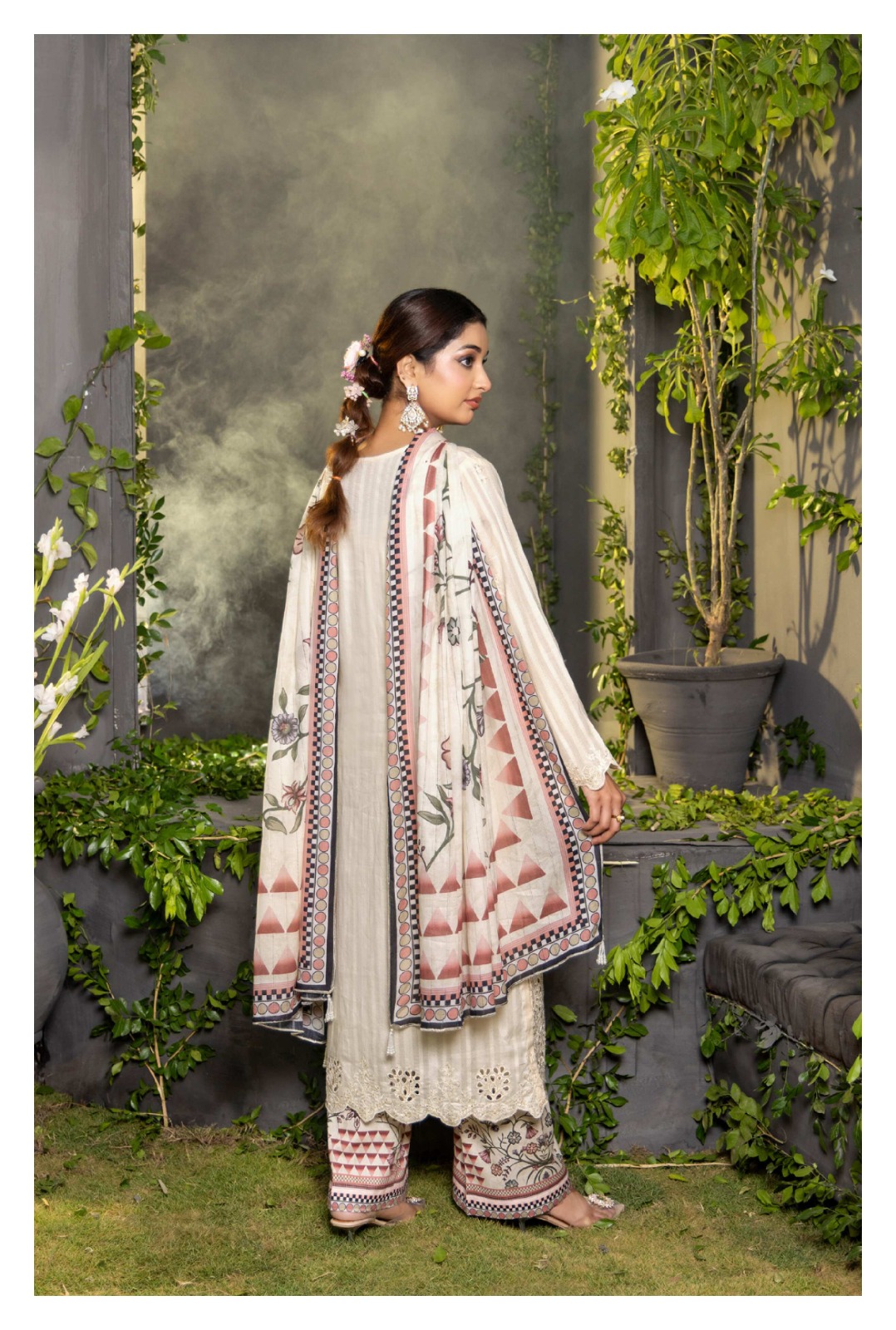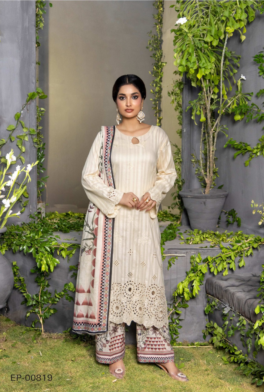 Make a statement with our three-piece embroidered Chikankari ensemble featuring a lawn, shirt and trousers paired with a blended dupatta.